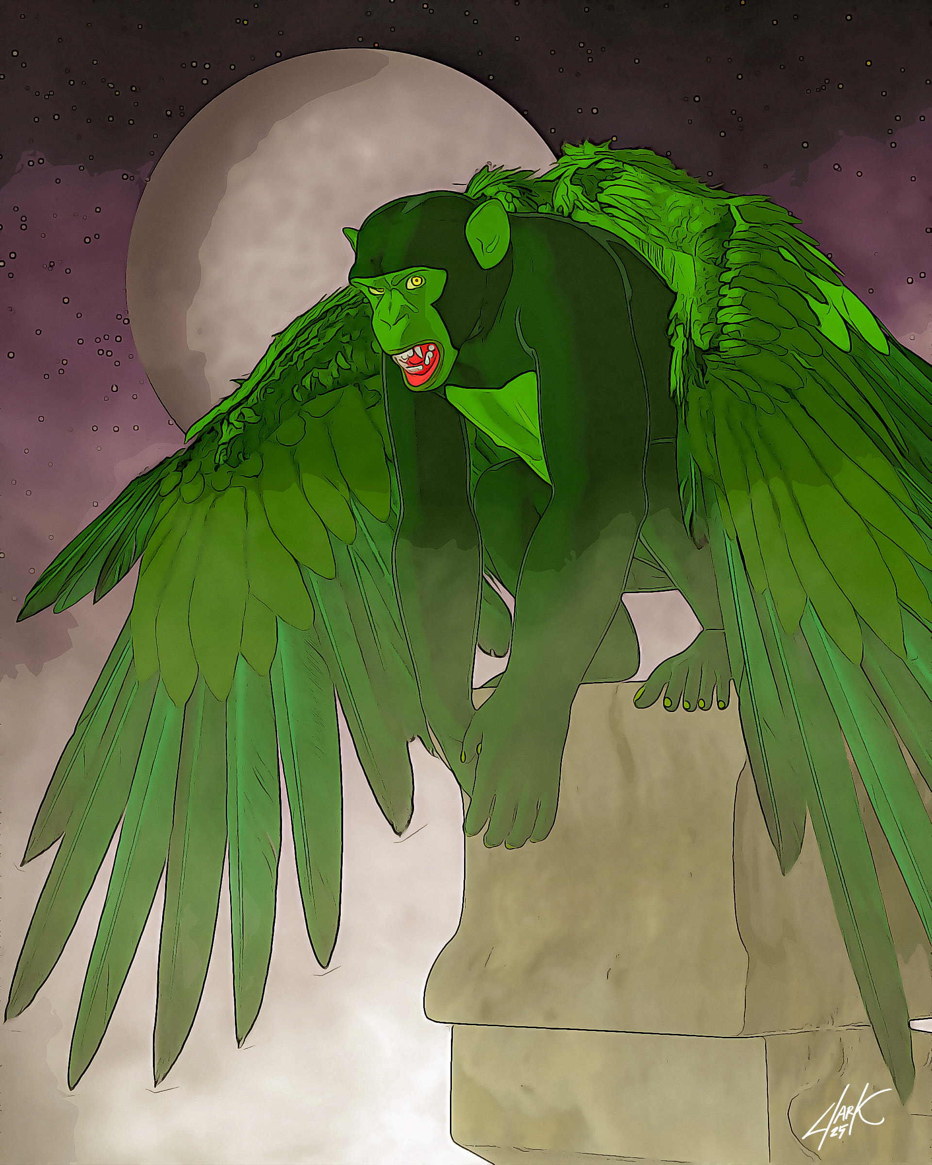 At any rate, today I finalized the model for the new winged chimps—just in time for them to appear for the first time in earnest in The Blood of Seven Queens #6—and I thought it would be fun to throw together an image for the Spooktober prompt word of “watchful.” Let me know what you think.