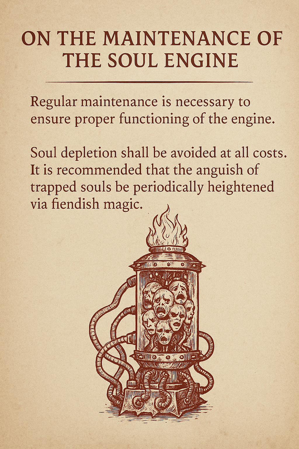 The Mortal Engine System represents the pinnacle of demonic innovation: our long-awaited victory over the instability of leyline sorcery. Whereas leylines resist corruption, souls submit. Through disciplined application of Soul Resonance theory, a captured mortal essence can be extracted, refined, and converted into a usable power source capable of sustaining engines, wards, and even entire cities.