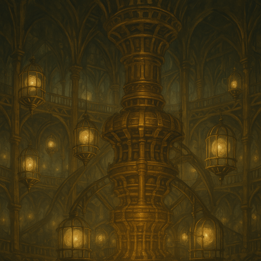 Deep below, the Forge itself is described by witnesses (few of whom remain) as a cathedral of brass cages, each suspended in humming symmetry around a central piston. Within each cage floats a glowing orb of spinning light, the captured essence of a gnome, once an engineer, now a component. The piston drives in rhythmic synchrony with the carnival above, pulsing with every cheer and shudder from the midway. The gnomish souls are said to power the Laughline System, a network so efficient it requires no leyline tether, feeding endlessly upon emotion and memory alike.