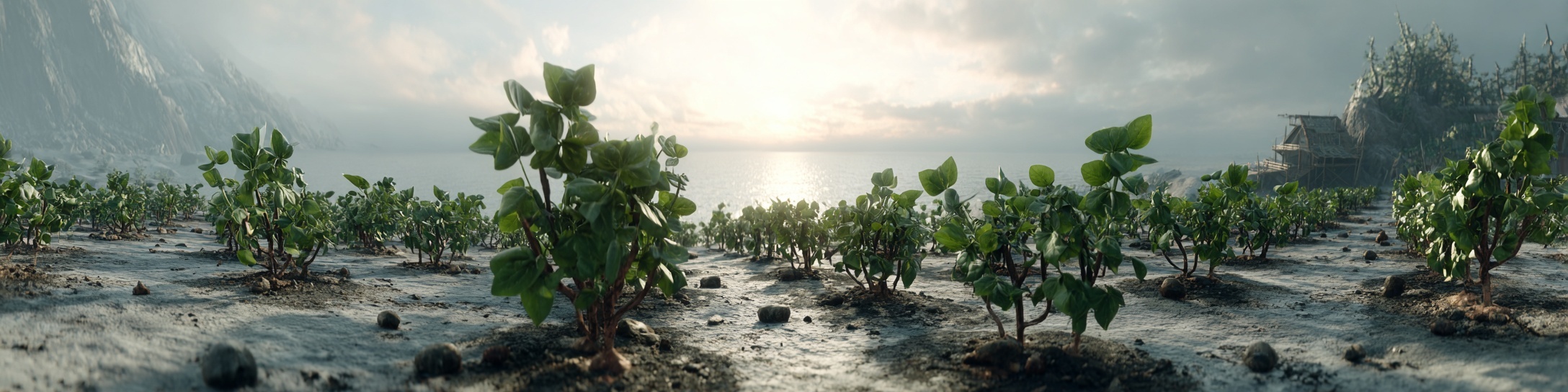 Ashbeans are a staple food wherever they grow, boiled into thick stews with roots and greens or mashed into hearty pastes spread on flatbread. Their natural smoky note lets even simple pots taste as if they have been cooked over woodfire, which makes them prized on Ubharnā, where fuel is often scarce. Dried Ashbeans travel well, and families store sacks of them against lean seasons or ship them in bulk to other islands and even Colwyn as a cheap, reliable source of protein. Some millers grind the beans into ashbean flour, a dense, nutty meal that is mixed with Cloud Millet or other grains to make travel loaves that keep for weeks and sit heavy in the stomach in a way sailors and field workers appreciate. Because Ashbeans repair and enrich the ash blasted ground they grow in, the Earth Steward favors their use in new and recovering fields. This has led some traders to press Ubharnā toward becoming little more than a bean granary. Islanders push back against that idea, wary of outsiders who see only cargo and not the careful rotations that keep their thin soils from washing away, and determined that Ashbeans remain a symbol of resilience rather than just another export to be stripped from their hard won land.