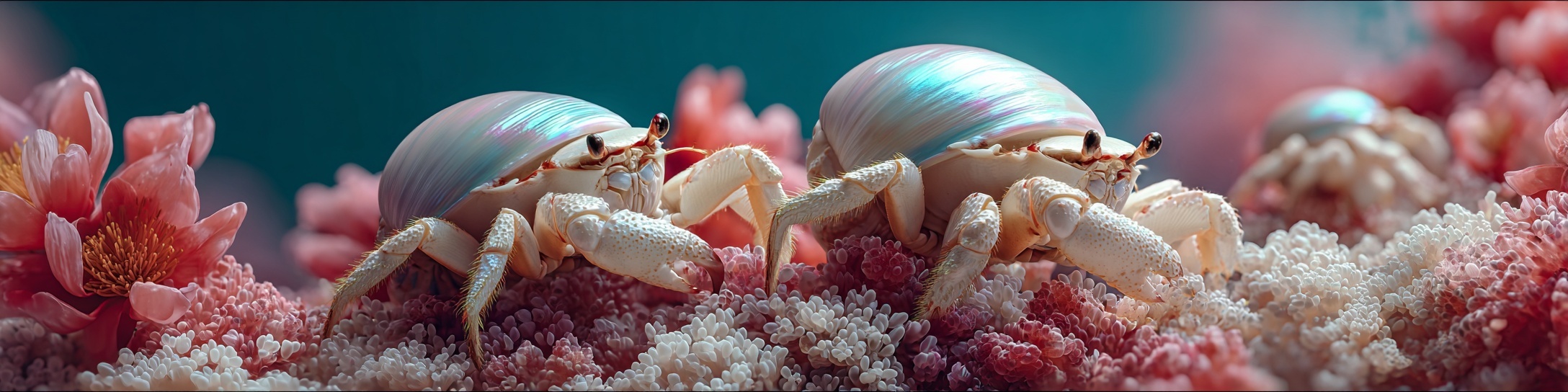 Crescent-Shell Crabs take their name from their distinctive carapace, which forms a smooth, arcing half-moon shape that tapers to fine points at either end. The shell is thin but surprisingly resilient, made of layered mineral deposits that create a natural iridescence resembling mother-of-pearl when caught by shifting light. Their bodies are compact and lightly segmented, allowing them to slip easily into narrow crevices within the reef. Each crab has six slender legs tipped with soft gripping pads rather than sharp points, an adaptation that lets them move across delicate coral without causing damage. Their paired fore-claws are small and precise, shaped less for defense and more for scraping algae, grooming coral surfaces, and manipulating bits of detritus. Crescent-Shell Crabs also possess two luminous sensory spots near the base of their shell that respond to changes in current and vibration. These faint glows pulse softly when the crabs are active, giving them a ghostlike shimmer as they move through the reefs at dawn and dusk.
