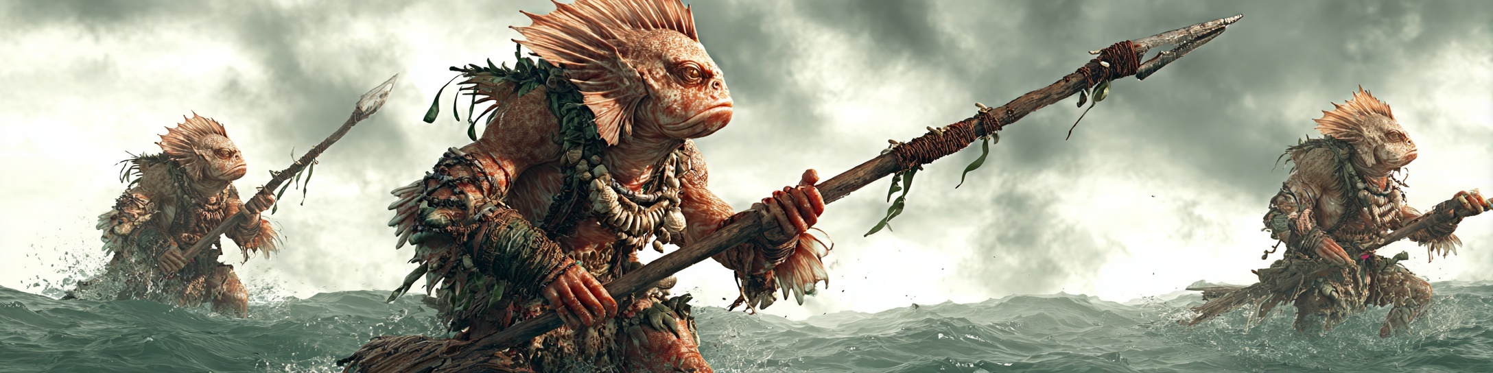 The Locathah of the Godslost Sea are the sea’s perpetual underdogs, tribal, migratory fish-folk who live in the dangerous shallows where sahuagin, demon-rays, pirates, and coastal powers all collide. They hunt the surf and kelp forests, scavenge wrecks, and raid when they must, but they rarely hold territory for long. Generations of war, slavery, and exploitation have left them wary and hard to break: a shoal may be scattered, but survivors always reform somewhere further down the coast. Sahuagin and ixitxachitl see them as expendable chattel; Pearl Elves and Tritons see them as tragic but useful allies. Locathah themselves see only this: no one else will keep them free, so they will do it themselves—one desperate, stubborn season at a time.