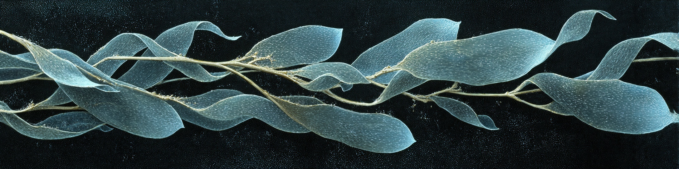Moonstring Kelp grows in long, ribbon-like fronds that can reach lengths of 10–20 feet, each frond only an inch or two wide but remarkably strong and flexible. The kelp’s pale coloration comes from its unusually thin epidermal layer, which allows moonlight and starlight to penetrate and reflect off the silvery fibers running along its interior, giving the plant its characteristic sheen. These internal fibers, known as lumen-strands, help the kelp maintain buoyancy and act much like tendons, allowing the fronds to undulate smoothly even in faint currents. The plant anchors itself with a dense, claw-like holdfast that grips rocky seafloors in temperate waters, and from this base it sends up multiple fronds that grow parallel rather than branching. Despite its delicate appearance, Moonstring Kelp is surprisingly hardy; its flexible structure allows it to withstand storms and tidal surges that would tear apart broader, heavier seaweeds.