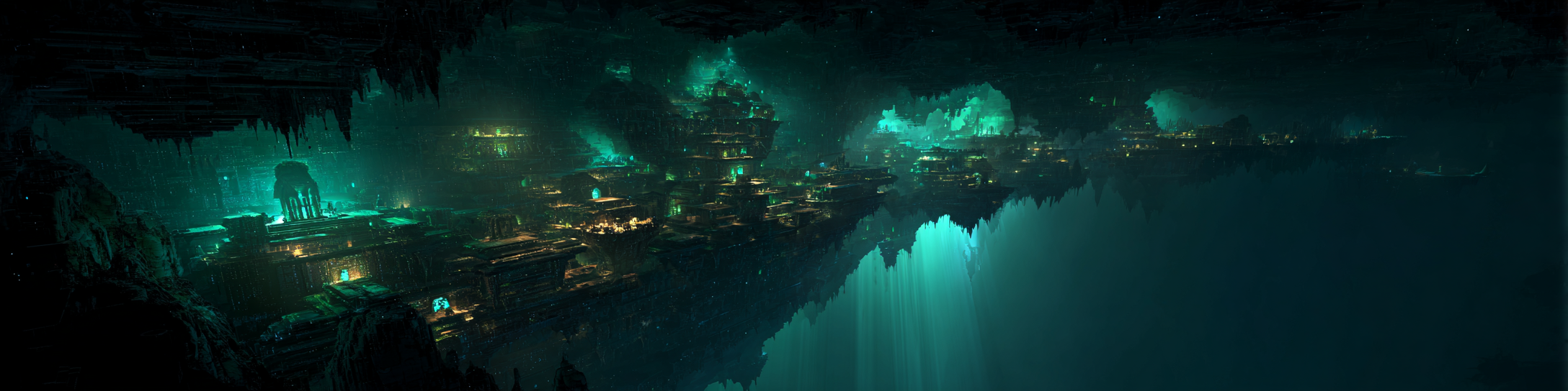 The capital city of the Tritons is Thal’Ruun Vassora, a vast stronghold hidden within a colossal cavern carved deep into the vertical wall of an oceanic trench. The city clings to the stone like a many-tiered bastion, its platforms and terraces suspended over a drop that descends into unbroken midnight. Here the water is so cold and so crushing that no surface-dweller could survive, yet the cavern glows with quiet, eerie luminance. Pressure-tempered structures rise in stacked layers along the rock, illuminated by controlled currents of bioluminescent flowstone that pulse through channels etched into the walls. From the shadows above, stalactitic ridges descend like the jaws of some ancient beast, while the abyss below swallows all sound and light.