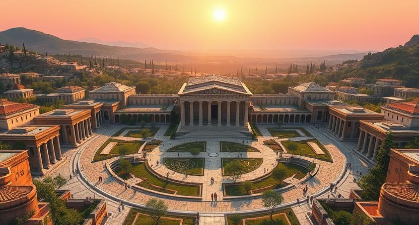 Amphalos is built around the Axis Forum, a serene plaza where the most respected schools hold public debates. From there, quiet cobblestone paths lead to courtyards, monasteries, and academies, all housed in pale marble and ivy-covered stone. The city avoids fortifications and markets, prioritizing gardens, libraries, and amphitheaters.