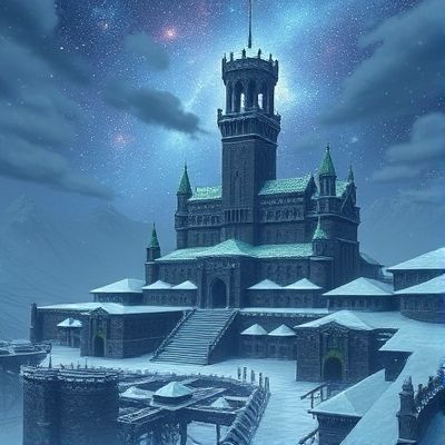 Perched atop a jagged glacial plateau, the Arcanum is a breathtaking fusion of ancient elven artistry and practical orcish fortification. Its central tower, The Frostspire, stretches high into the pale sky, carved from living ice and veined with glowing silver filigree that channels leyline energy.