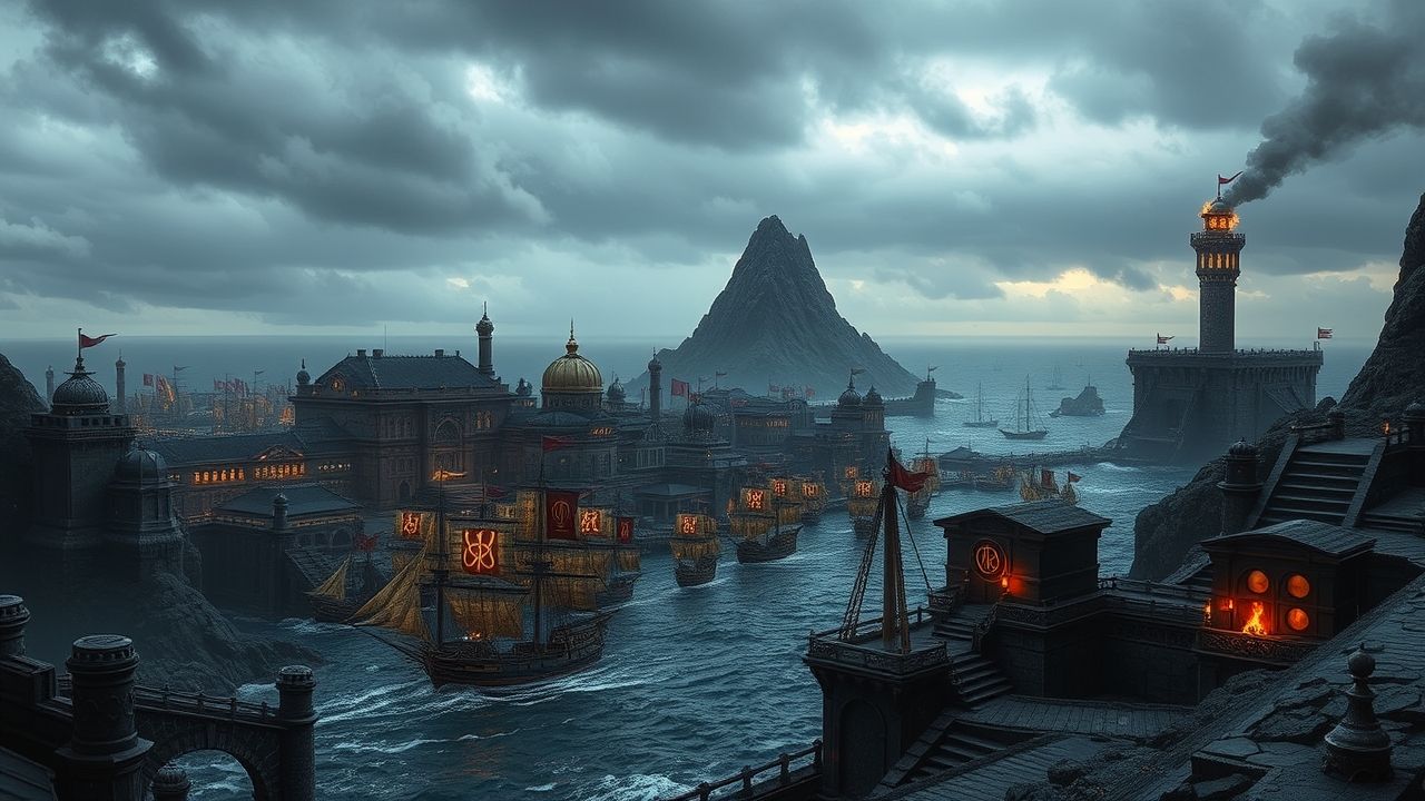 Arim boasts one of Sulkara's most well-fortified harbors, protected by obsidian seawalls and watchtowers that can hurl botls of flame or steam. The Crimson Fleet, a special branch of Sulkara's navy, is headquartered here, and the main city is overseen by the Ember Watch.