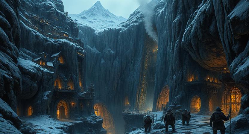 Above ground, Dolum is compact and austere. Buildings are squat and stone-built, with heavy shutters to guard against mountain winds. Most roofs are slate, and the roads are hewn directly from the bedrock. Below ground, however, Dolum becomes a different world. Great chasm-halls are supported by ancient pillars, glowing with phosphorous moss and enchanted torches. Elevators operated by gear-driven counterweights ferry dwarves up and down the mining levels.