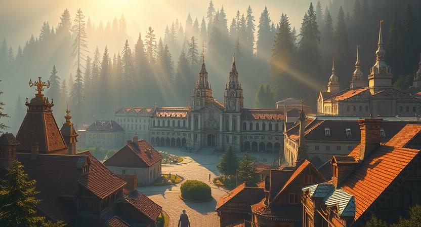 The city is organized in a circular shape, hugging the edge of the Shadelight Forest, with roads radiating outward toward key trade routes and border crossings. At the heart of Karlstadt lies the Sanctuary of Dawn Ascendant, a grand marble and timber cathedral built on the very hill where the first Sovereign is said to have met directly with Lathander. Around this holy site, shrines, pilgrimage hostels, artisan quarters, and lumber mills form an energetic and devout community.