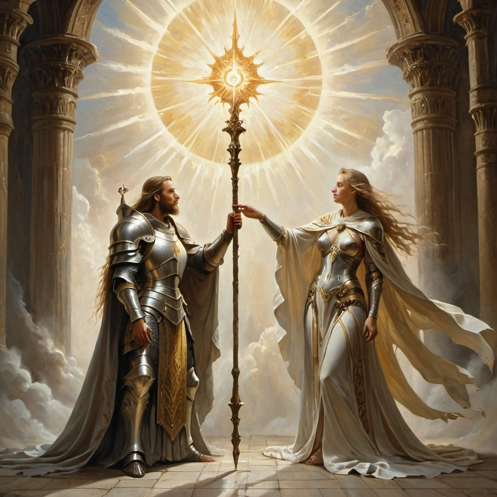 One of the most prominent murals in the Grand Cathedral of Light in Mecklenberg is a depiction of Lathander (left) imbuing his power into the First Sovereign at her coronation, pictured below. The Staff of Light depicted here is still used as the symbol of the Sovereign's divine authority.
