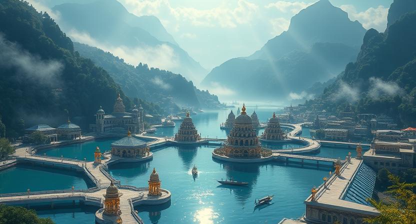Built along elegant causeways and upon floating platforms, Limneon’s buildings are low, sweeping structures of pale stone, blue tile, and polished wood. Walkways span the lake’s surface, often lined with reeds, lotuses, and softly glowing lanterns. The central islet houses the Sanctuary, while small ferries and quiet canals connect the outer quarters nestled along the wooded lakeshore and terraced cliffs.