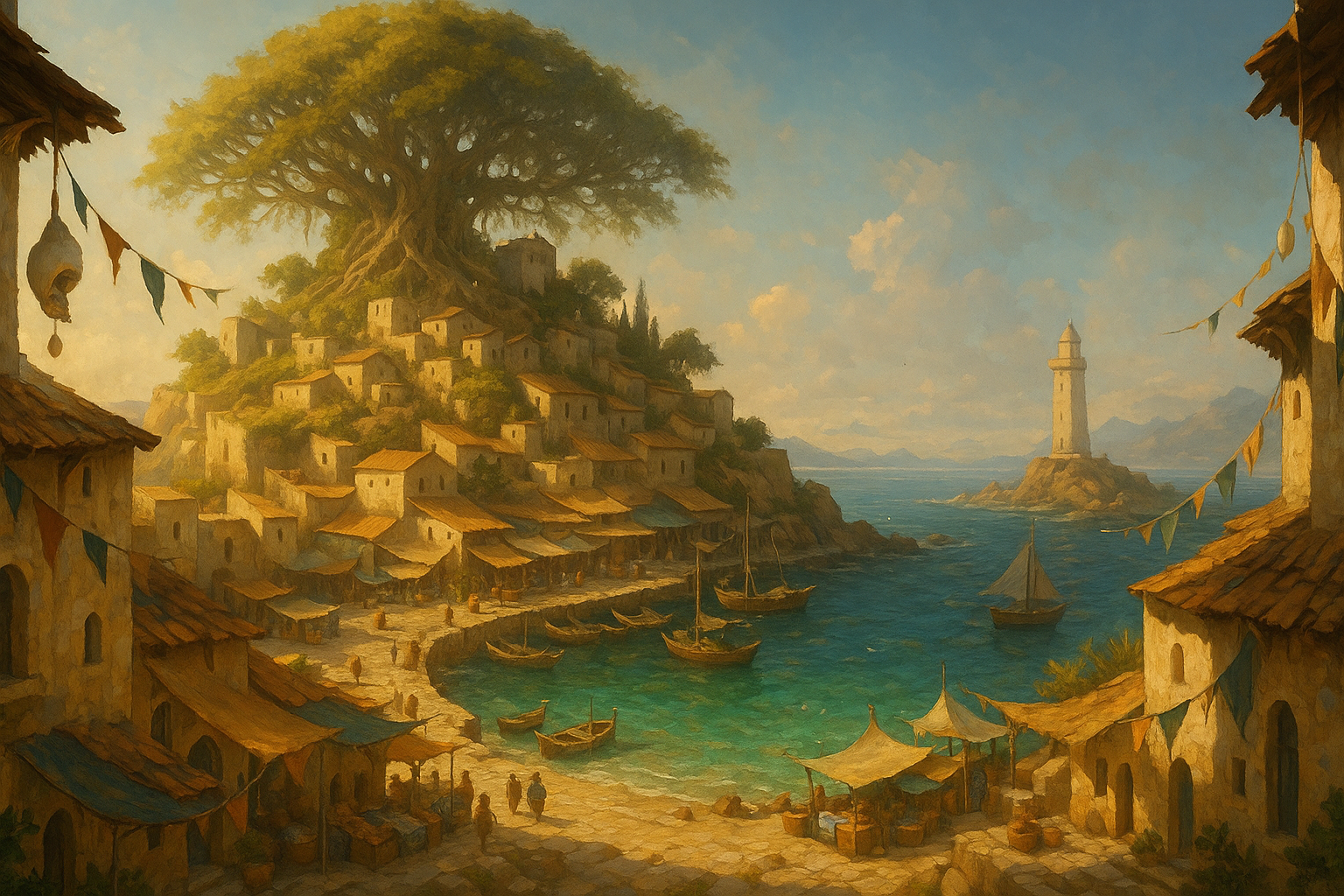 The island is small and hilly, rising in terraces from the harbor. Narrow streets weave between sun-bleached stone houses, all facing the sea as though in prayer. Boats of all sizes bob in the turquoise shallows of the bay, protected by a reef that glows faintly at night. A massive banyan tree grows from the ruins of an old temple at the island’s center, its roots said to whisper to the faithful.