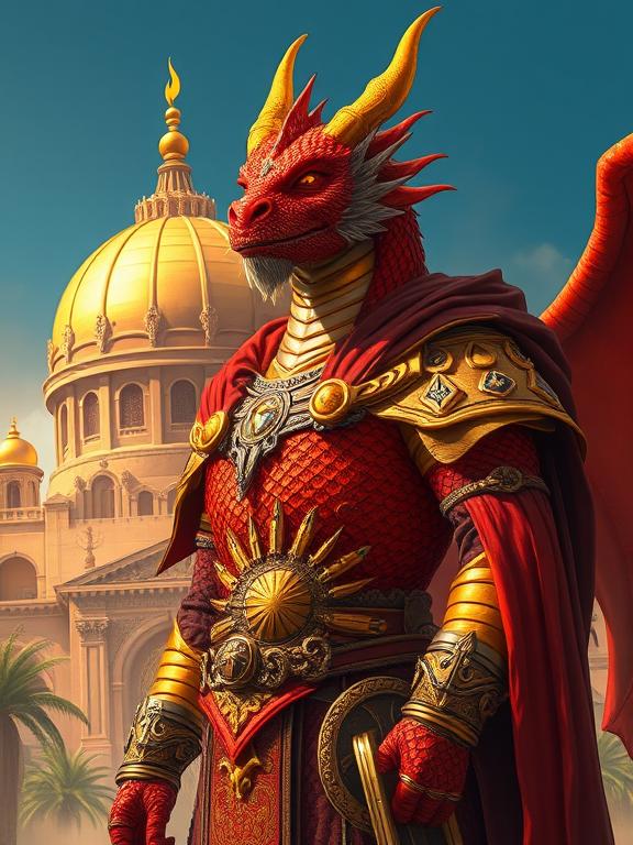 Naazil is physically imposing, tall even among dragonborn, with gleaming crimson scales that shimmer like molten gold in the sun. His golden eyes burn with ambition and calculation. He dresses in opulent layers: gold-threaded cloaks, armored ceremonial sashes, and jewelry styled after ancient Vaaskyri dynasties. A golden sunburst is etched into his chestplate, and a wide scar runs down one cheek, unhealed as a mark of honor.