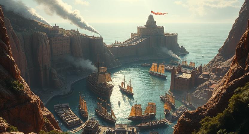 Set where the jungle thins and the cliffs give way to the sea, Ralaq is a gleaming port city of red stone and scorched brass. It’s a city built on fire and fortune, a place where merchant vessels unload crates of exotic wares under the watchful eyes of naval guardians, and where every dockside tavern buzzes with trade deals, rumors, and rivalry. Ralaq is both a shield and a gate: a critical harbor for Vaaskyr’s southern trade and the first line of defense against maritime threats.