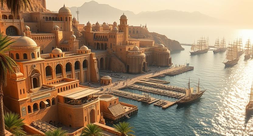The city’s architecture is marked by layered terraces, wide colonnades, and sandstone walls inlaid with mosaics of sapphire and pearl. Buildings are low and reinforced against both desert heat and coastal storms. Rich neighborhoods rise along the southern cliffs, while the Salt Quarter, home to dockworkers, sailors, and merchants, buzzes with activity by the waterfront.