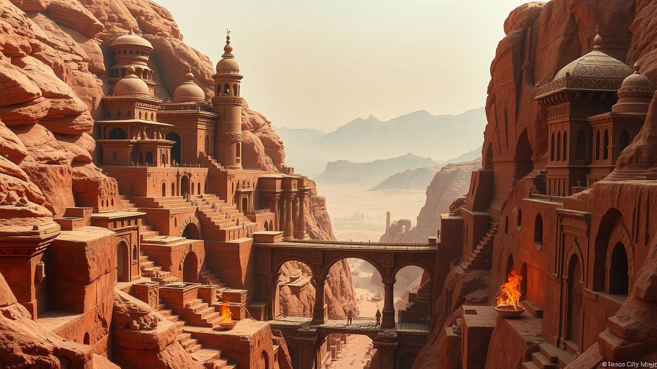 A massive natural chasm called the Mouth of Uhar splits the city’s upper and lower halves, crossed by an ancient stone bridge. Below lies a field of tomb-temples and ruined columns, the remnants of a forgotten empire.