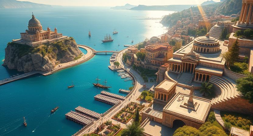 The city unfolds along a crescent-shaped harbor, with alabaster buildings climbing the hills in layers. Most homes have sun-washed stucco facades, red-tiled roofs, and inner courtyards framed by olive trees and marble fountains. Narrow streets lead upward to the Agora of Thought, a central plaza lined with statues of famous orators, thinkers, and revolutionaries.