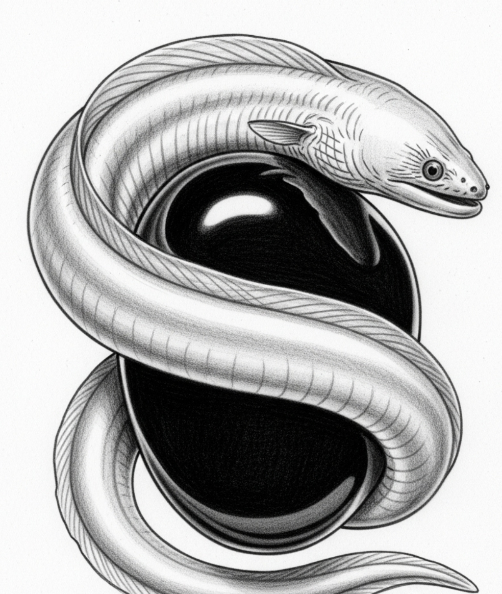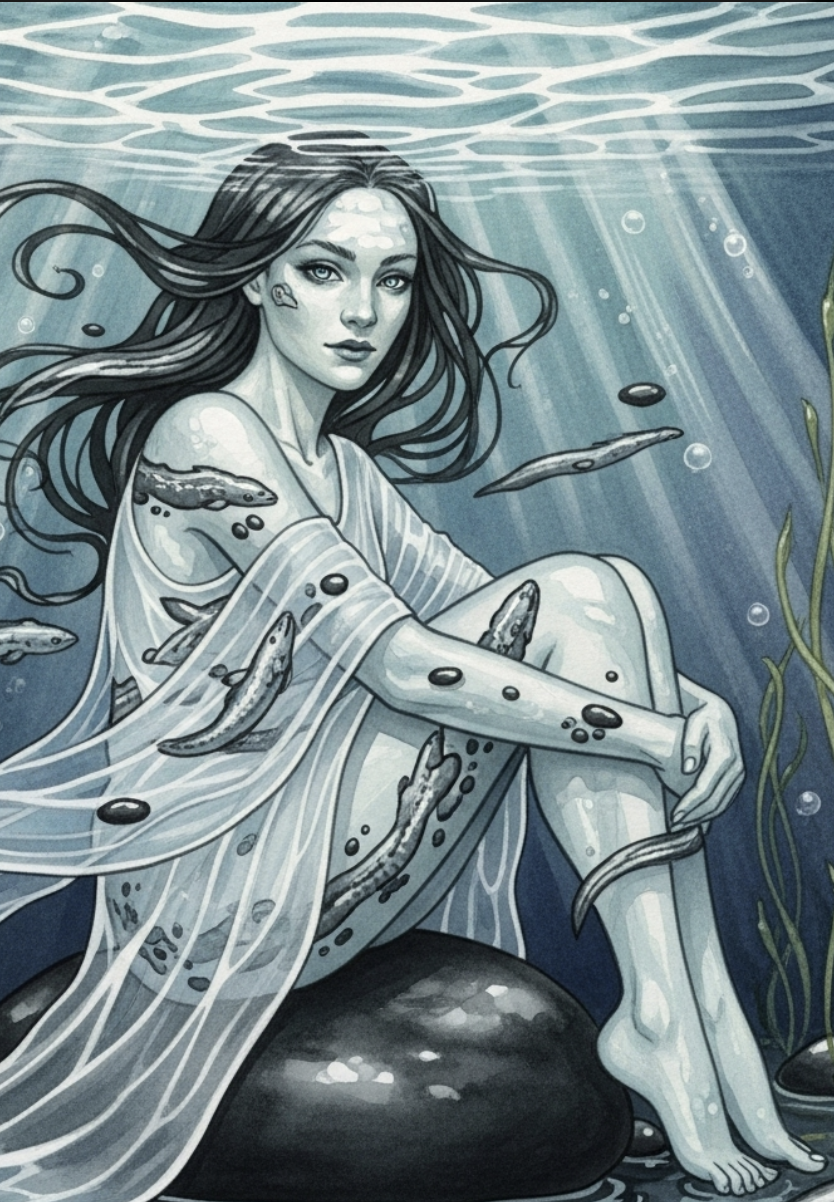 Her holy symbol, a silver eel wrapped around a black stone, speaks to the core of her being. The silver eel embodies the fluidity of deep water, the elusiveness of memory, and the quiet, sinuous movement through hidden spaces. The black stone represents the stillness of the deep, the weight of forgotten things, and the silence that blankets the bottom of her watery domain.