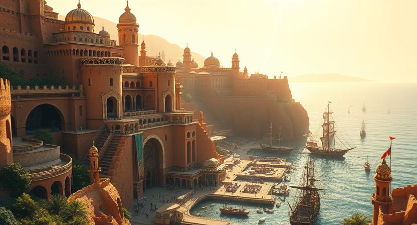 Buildings are made of red-orange sandstone, with brass-inlaid mosaics and arched, breeze-catching rooftops. Tapestries bearing family sigils flap in the sea wind, and the scent of spiced wine, brine, and roasting fish hangs in the air.