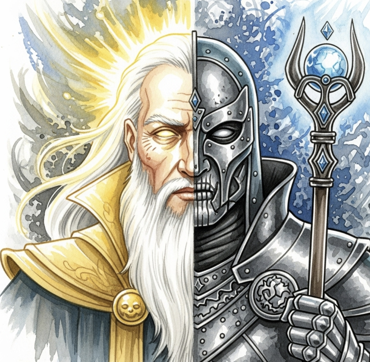 Thaloras is the god of hidden truths, balanced law, and unyielding logic. Depicted with a face split down the middle—half luminous scholar, half masked inquisitor—he embodies both benevolent wisdom and cold, unrelenting order.