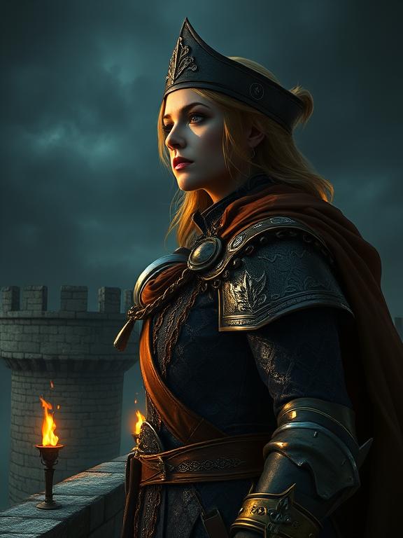 General Corwin joined the Dawnwatch when she was 19, attending the military academy at Korham and taking command of a small outpost near the Tanarian border as her first assignment. She rose through the ranks and was appointed General by Sovereign Koletta in 1680. She took command of the fortress-city Aurilon after completing a year of study at the Ecclesiastical monastery in Klosterdorf, allowing her to be appointed Pralat.