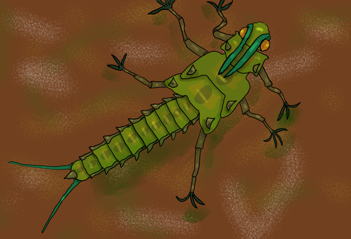 Bog Titan nymphs hatch directly into fresh water pockets within the swamp. At this stage, their bodies resemble the upper half of an adult, with a developed head, partial dorsal plating, and only four legs. They are much smaller and rely heavily on interaction with the hive.