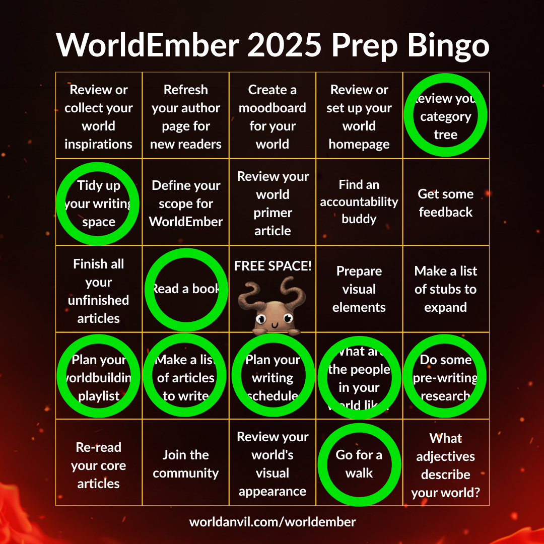 Pour le bingo, j'ai décider de ne pas seulement faire une ligne mais aussi les autres cases que je trouve utile pour me préparer pour WorldEmber.