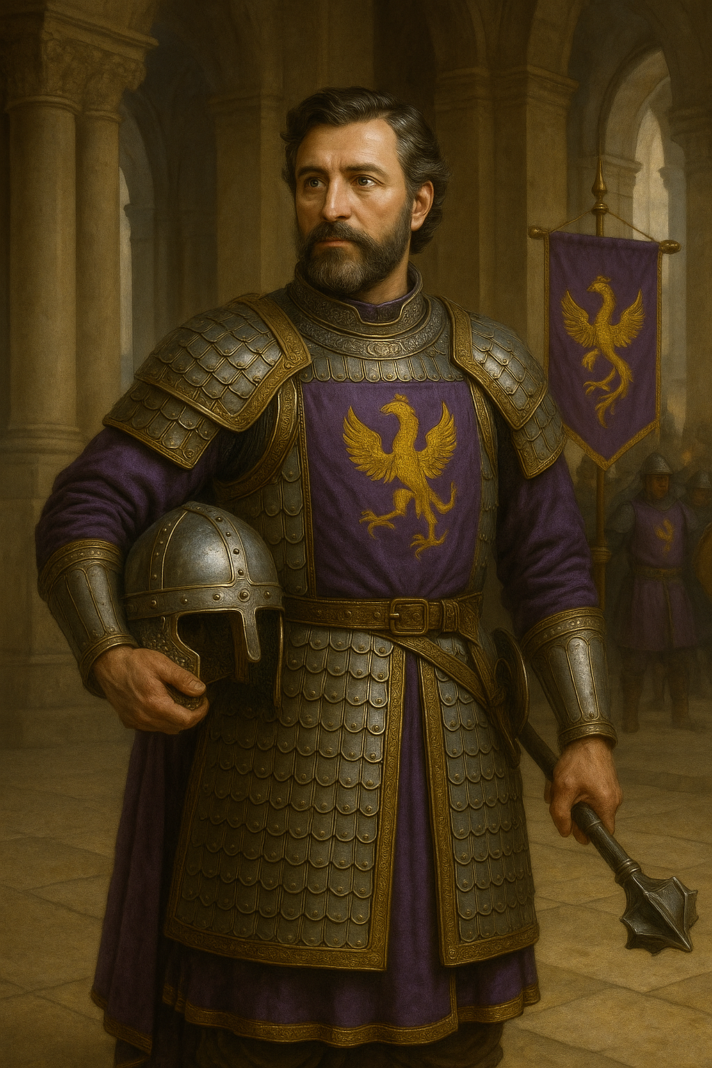 Justinian Aquilar, fourth of six children, was born within the marbled halls of the Sultan Sultan Theodosuis II . His father, brother to the Sultan, ensured his children were schooled in both diplomacy and the art of war. Yet it was the clang of steel, not the sound of courtly debate, that drew young Justinian’s heart. Gifted with sharp reflexes and unflinching resolve, he rose swiftly through the ranks to the Lion’s Guard Cataphracts, earning respect for both his discipline and valor. At thirty-one, the Sultan appointed him Ambassador of the Realm, entrusting him with a personal retinue of guards to enforce imperial decrees across the provinces. Despite his charm and insight, Justinian’s moral code is unwavering, removing context or equality from his decision making. This also leads those around him to feel judged- often clashing with foreign lords who mistake his confidence for insolence. Loyal, intelligent, and unwavering in purpose, he serves as both blade and voice of the Sultan’s authority beyond the capital’s shining walls.