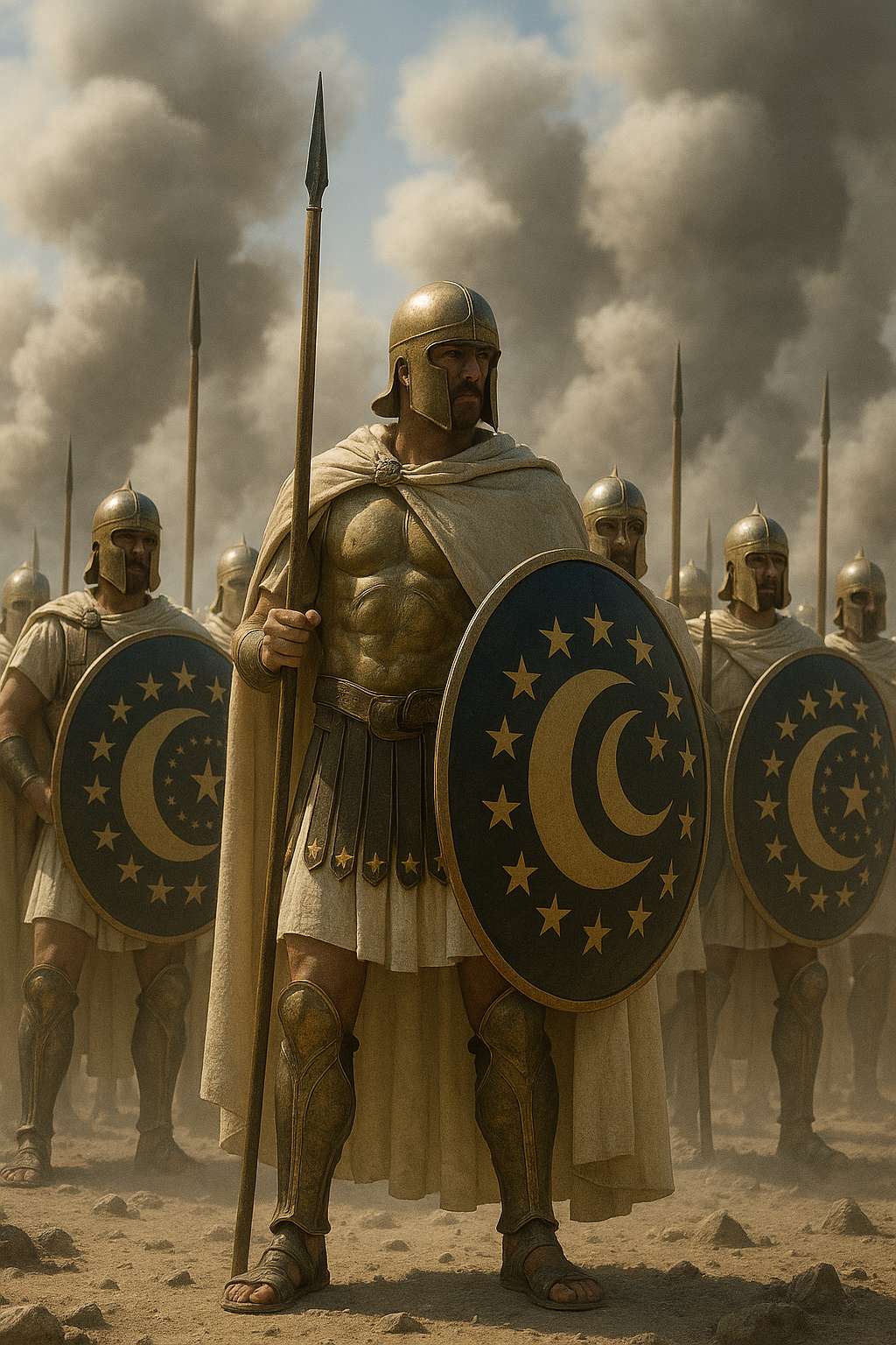 Moonshadows heavy infantry response to a new enviornment in the Northern Plains and the growing power of House Ironhelm . These heavy spearman are used to fighting in the desert and the snow alike. They wear heavy lammallar armour, covered with with flowing cloaks in a desert enviornment to combat the sun and hot weather. They wear heavy bearskin cloaks in the snowy enviornments.