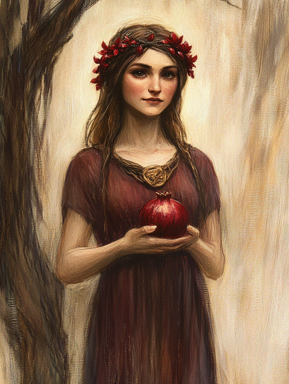 Mikor az utolsó halott levél is lehullott a mélység kertjeiben, egy goti asszony Persephoné elé vitte az utolsó gyümölcsöket. Az Alvilág újdonsült királynője szomorúan forgatta karcsú ujjai közt a gránátalmát, ám hirtelen új ötlete támadt. Lehet, hogy az Anya ereje nélkül nem nőhetnek növények, de a körforgás törvénye örök, azt nem szakíthatja meg átokkal senki, így megparancsolta, hogy a holtakat vigyék a fájához, s alkotni kezdett. Az Anyától megtanulta az élet körforgását, s Lélekőr oldalán pedig megjárta a halálét. S ő lett hát az egyetlen, aki e kettőt egyesíthette az újjászületésben.