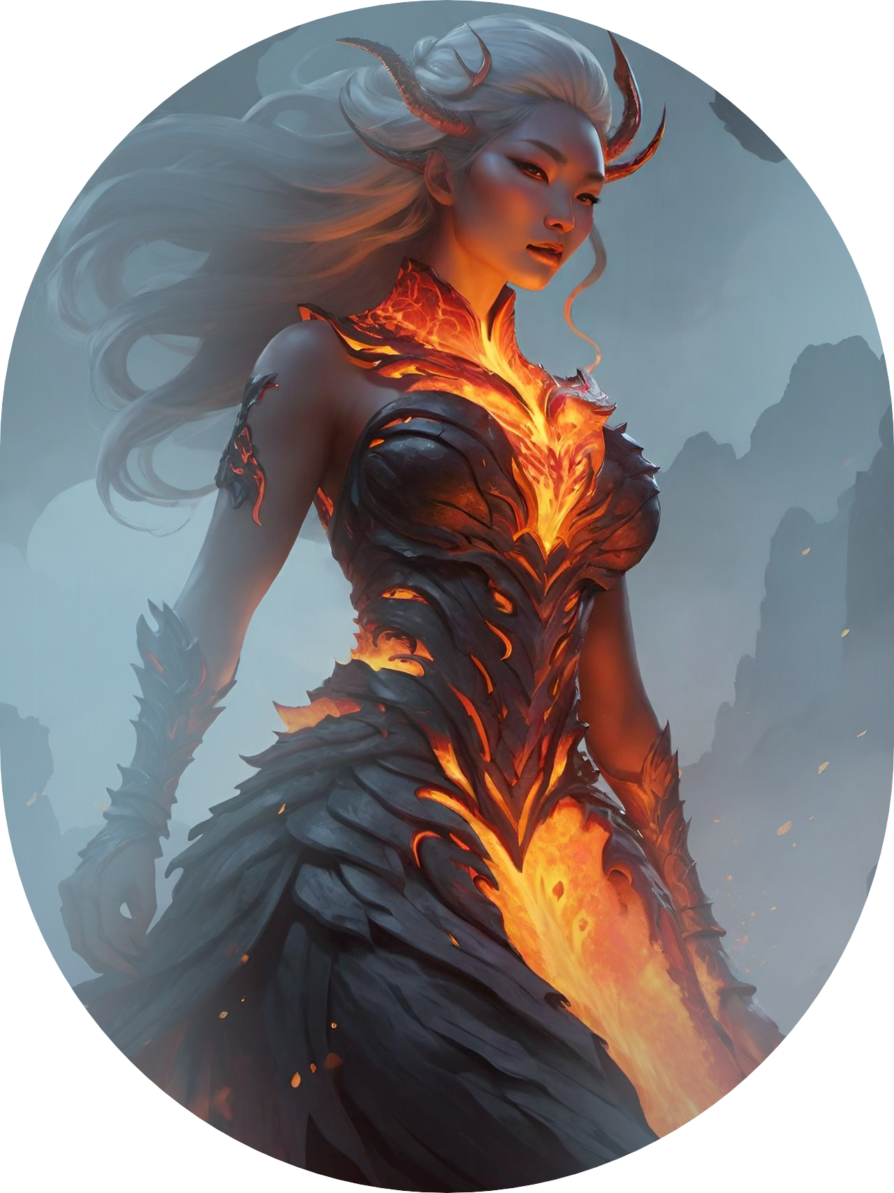 Ralgotar's Body allows Zetian to convert any or all parts of her body into lava! She can maintain a human shape or morph herself how she pleases, moving and acting as lava normally would--even melding into lava in her environment. And when using her magic form, she is immune to fire and extreme heat (she actually finds it rejuvinating!) However, this extreme ability can leave her surprisingly brittle and vulnerable, ever conscious of hiding her weaknesses. Like other Body manifestations, separated parts of her lava, any missing pieces left behind, translate into lost flesh! Anything stuck in her lava when she transforms back will become lodged in her body as well. But for her form specifically, this becomes more likely and more drastic in the face of rapid cooling! Her body becomes solid when rapidly cooled, breaking away into brittle chunks. Even if she keeps all of her pieces together, her body temperature plummets with each instance! Not only does it slow her down in her lava form, but if she isn't careful she can become hypothermic. And while she can expend energy to heat herself back up, this act eats up more of her energy than anything else and quickly depletes Zetian.