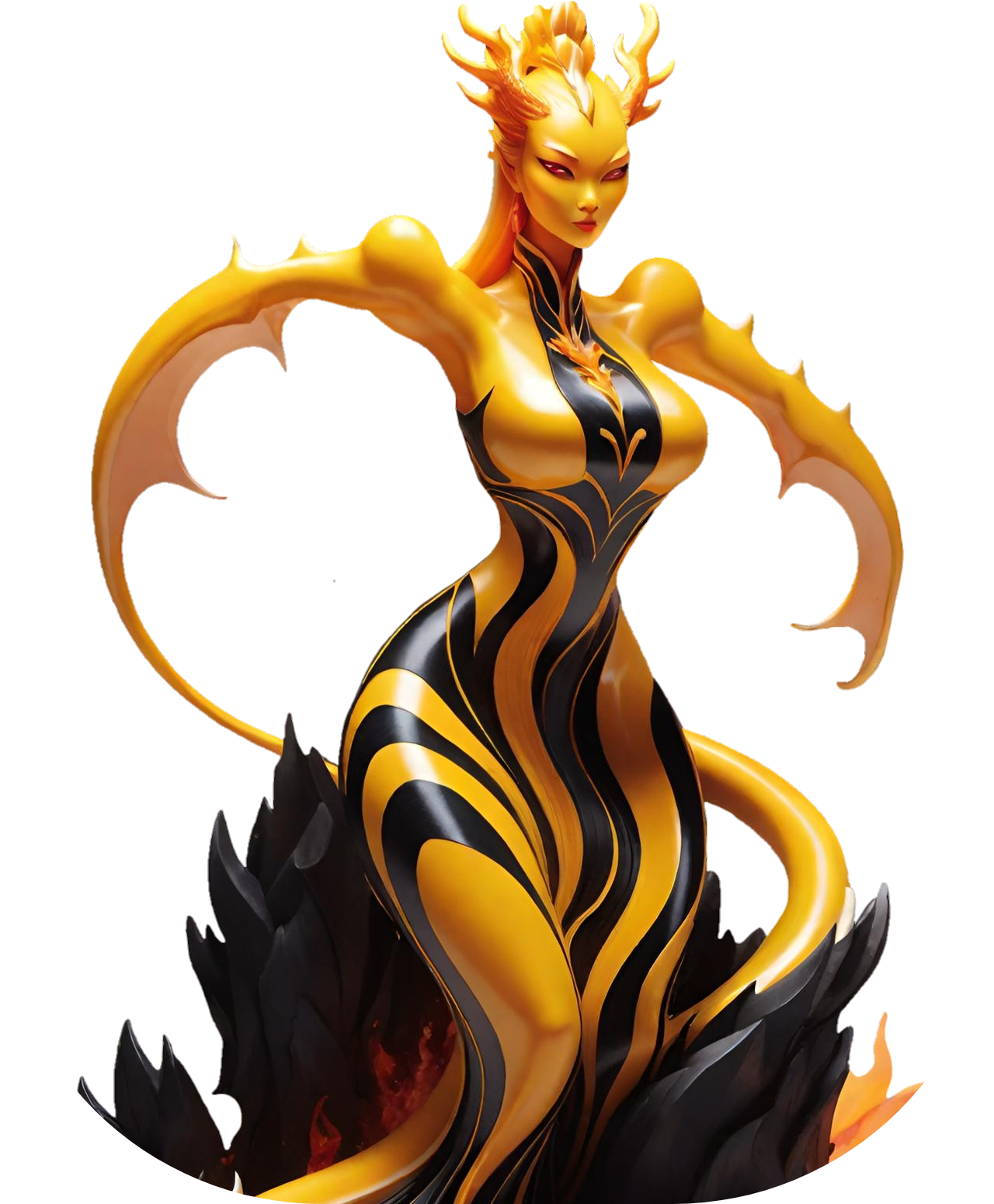 In battle, Zetian makes ample use of her sharp white talons and might fully armor her body with shimmering dragon scales, able to manifest them accross every inch of her skin. Most of these scales are azure blue but the stretch of scales from her chin, down her neck and along her belly are actually yellow. The molten gleam flowing underneath her draconic hide become more apparent in combat, burning those foolish enough to touch her scales. But her most drastic transformation is granted to her by her divine ancestor--transforming herself entirely into lava! It starts within the core of her body and, when shifting completely, lava spills from beneath her scales until they are overtaken, seeming ot melt away. |