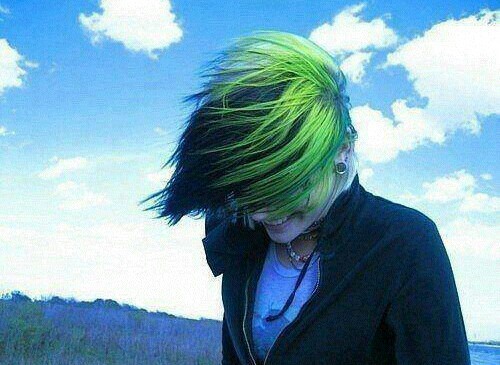 Green and black hair, piercings, as well as a tall lanky appearance