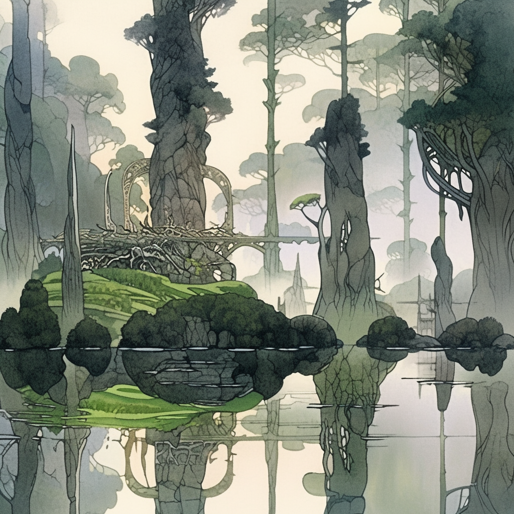 Guardinal and watcher patrols are common in the swamp, and the lighthouses help guide travelers along the River Oceanus towards the headwaters at Thalasia. The thick gray fog hangs over Belierin constantly, obscuring vision and sound, and few travelers enjoy navigating its murky terrain. The weather is rarely a factor though, and the seasons don’t do much to change the cloying moisture that permeates the fog and clings to the skin.