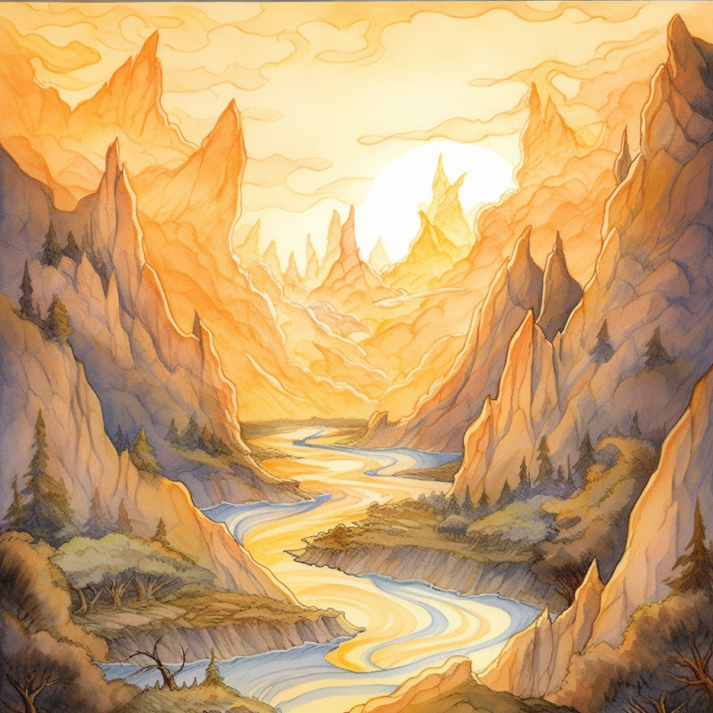 Beyond Lunia sits Mercuria, the Golden Heaven, where a vibrant golden light always fills the sky. The air is thinner here than on the Silver Heaven, but the mountainous slopes are mild and easy to ascend. Swift-flowing rivers of honey-colored water race through gentle valleys and empty into numerous lakes, many of which rest upon one of the numerous plateaus.