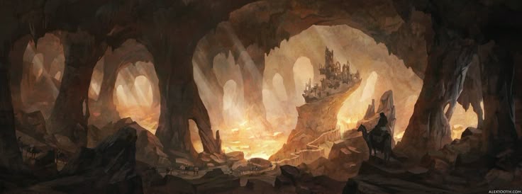 The largest natural cave in the Plane of Earth is the Great Dismal Delve, which forms the epicenter of the dao and their enterprises. The delve itself is a massive cavern shaped like a crevasse, about 60 miles wide and 120 miles long. The ceiling stretches up to a height of a half mile and is filled with stalactites of all shapes, though their natural formation is a mystery as there isn’t enough moisture or condensation in the cave to support the quantity or size of the stalactites. The Great Dismal Delve’s walls are honeycombed with passages and tunnels dug by the slaves of the dao, and the floor is a rocky mixture of natural stone structures, edifices, and bizarre fungal gardens.
