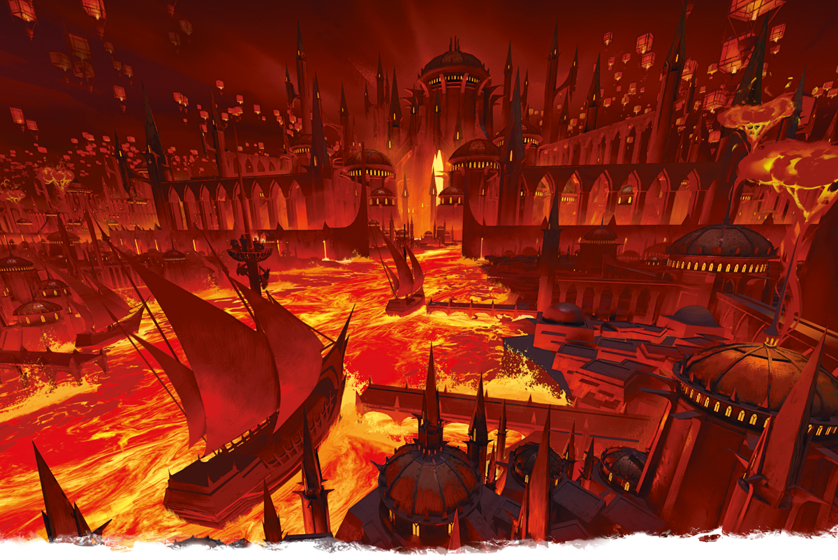 The City of Brass has numerous neighborhoods, ranging from the opulent obsidian manor houses around the Charcoal Palace to the poorest slums and alleys where beggars and thieves ply their trade. All buildings are made of rock, such as granite or basalt, as nothing lesser could withstand the intense heat of the Plane of Fire, and the streets are unkempt stone cobblestones in the lowest sections and paved brass, copper, and iron in the wealthier districts. Canals of molten lava cut through some areas, flowing from the raging Sea of Fire through and around the mounds and spires that make up the city’s tallest structures.
