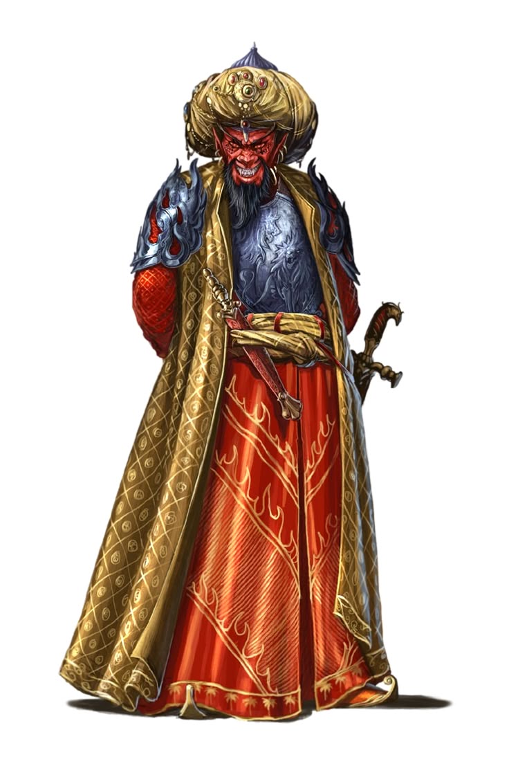 In his Charcoal Palace within the bustling City of Brass, the lord and master of all efreet sits. His titles are long and include Grand Sultan of All the Efreet, Lord of Flame, the Potentate Incandescent, the Tempering and Eternal Flame of Truth, the Most Puissant of Hunters, Marshall of the Order of the Fiery Heart, the Smoldering Dictator, and the Crimson Firebrand. Currently, the efreeti Marrake al-Sidan al-Hariq ben Lazan stands as the Grand Sultan, though there are challengers among his court that would see him deposed.
