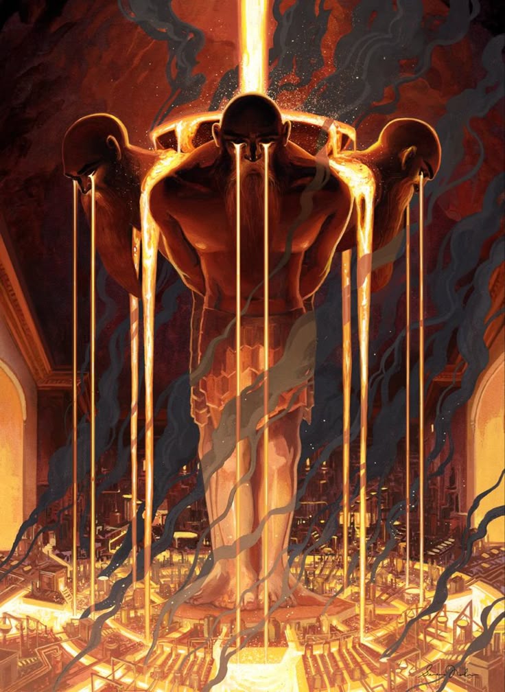 The heat provided by the Titan’s Kiss was said to come from a slumbering primordial god of ancient elemental fire, dormant in the rocks. The rhythmic rise and fall of its breath gave the forge its great potential. The Azer called this the Titanforge, and with it, they built some of their most powerful relics. Many were specially commissioned by influential patrons, including the Grand Sultan of the Efreeti, who is said to possess today some colossal weapon created from the heart of the Titanforge.