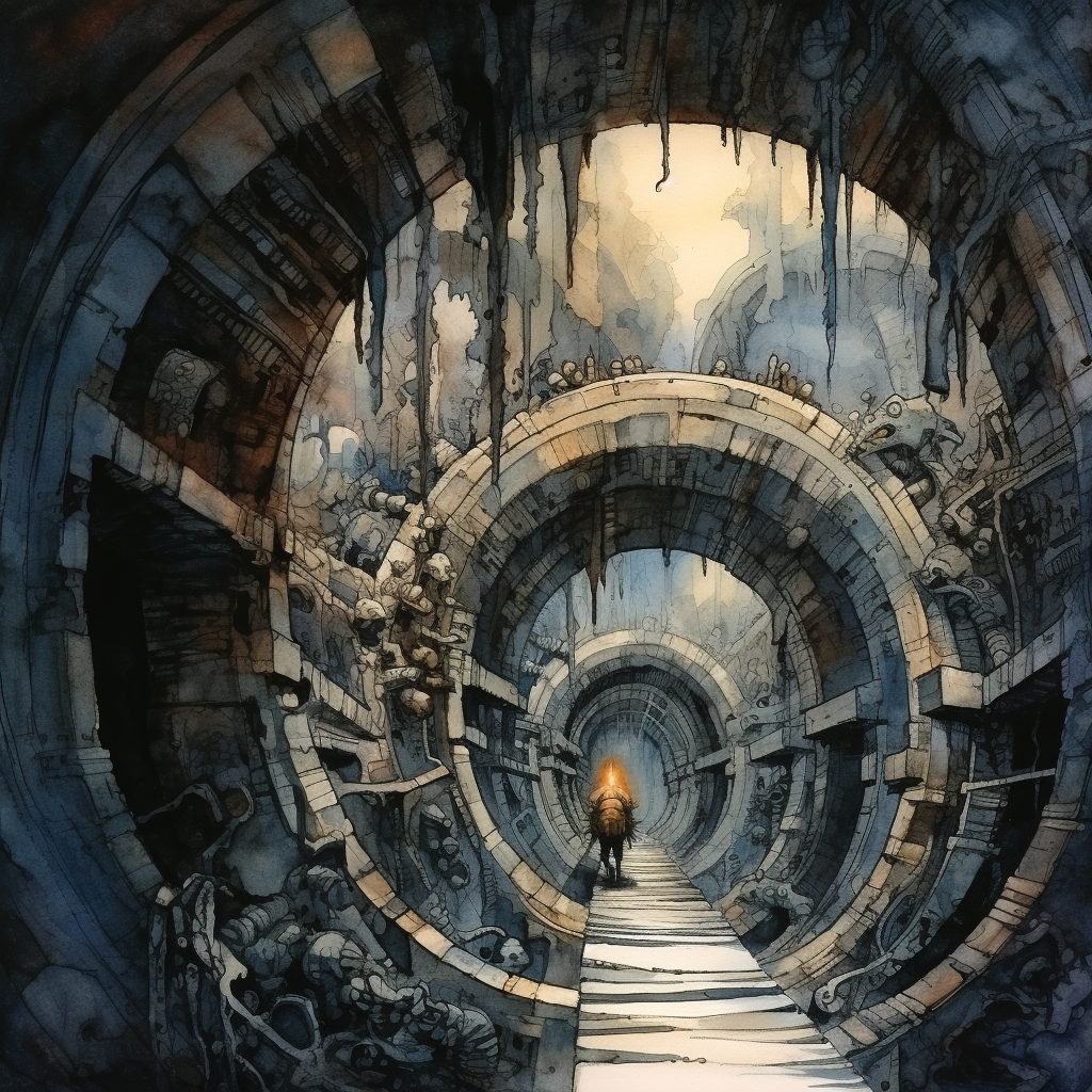 Most of the tunnels and passages are free of impediments, making actual travel the least problematic part of the plane. The top layer of Pandesmos has very wide tunnels big enough for flying ships and great winged beasts, and the trend continues through much of Cocytus with its strangely worked stone chambers and tunnels. However, most of Phlegethon is not so wide, and many of its stone arteries are barely wide enough for humanoids to walk single file.