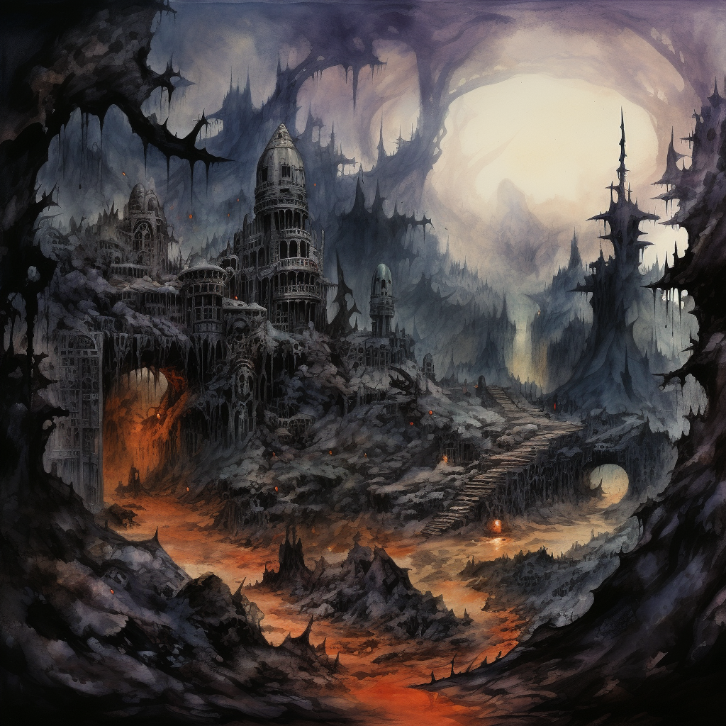 Pandemonium also hides dark and terrible secrets in its depths. The planar walls between the Outer Planes and the dangerous Far Realm are thinnest here, and many planar scholars point to the Far Realm as the source of Pandemonium's wind and madness. Enormous creatures born of titanic nightmares ooze through the lower tunnels of Pandemonium’s depths, ancient entities from lost epochs beyond time and space. Some caves are filled with ruins of lost cities.