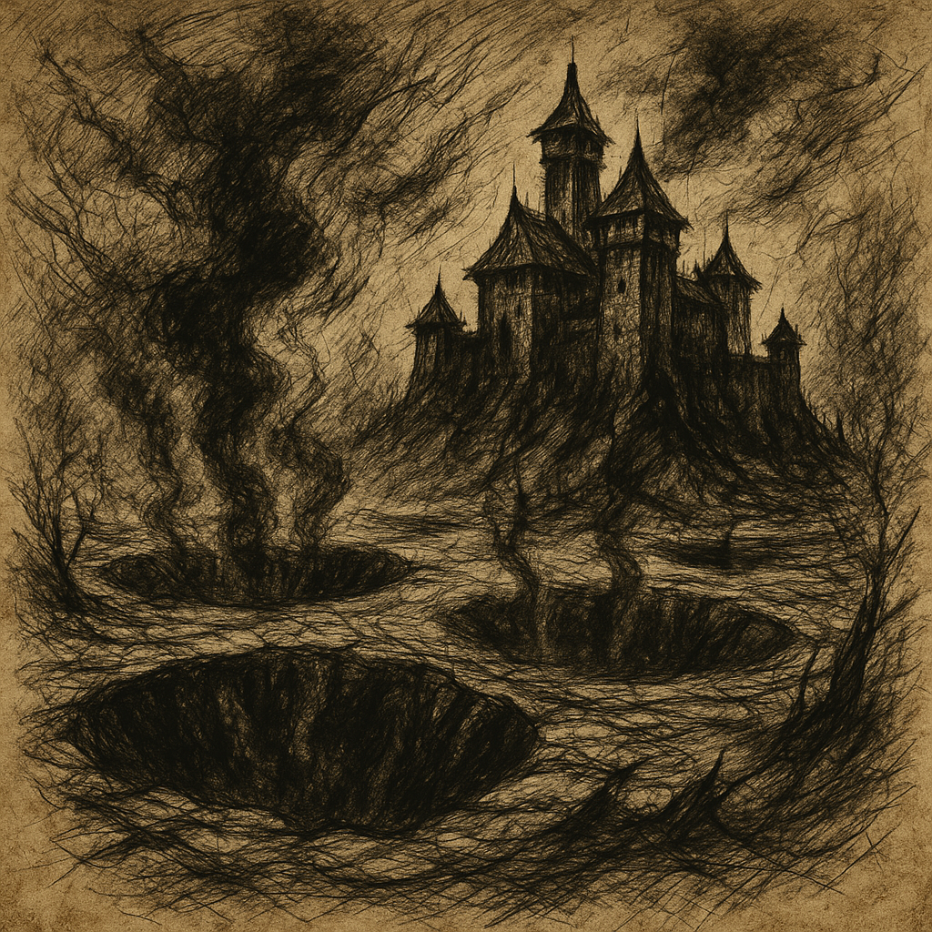 Encircling many of the pits are ancient fortress-barrows, earthen mounds reinforced with blackened stone. Each is crowned with ruined keeps whose foundations sink directly into the chasms themselves. Rusted chains seal the gates, and the corridors inside twist in circles around the pits, as though to contain something that should not escape.