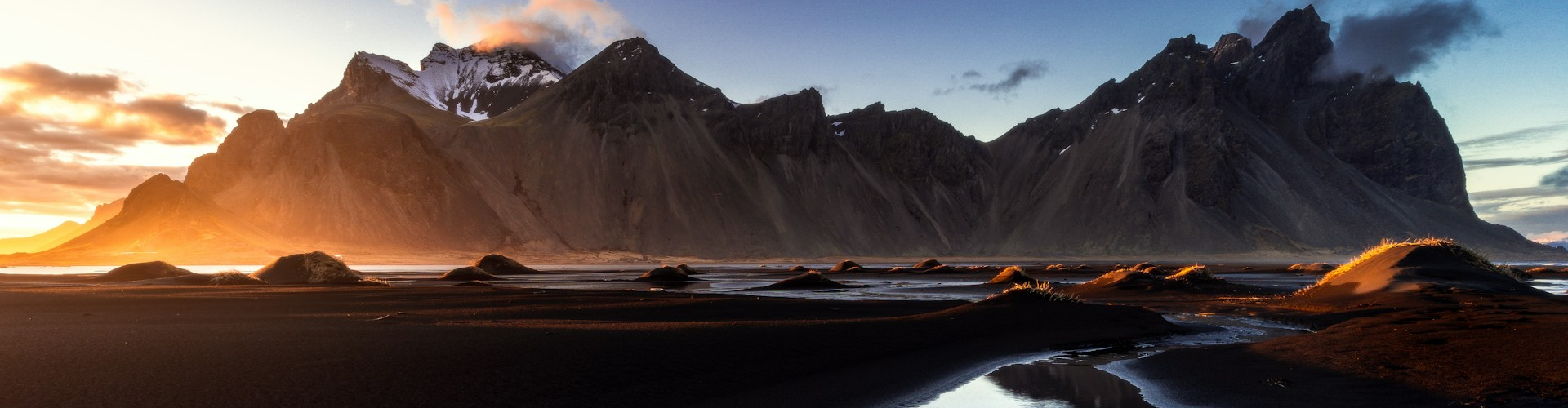 The islands themselves are characterised by pitch black rock and dark sand beaches, sharp peaks jutting into the frosty sky. Each island has at least one active volcano, though most have more, with more still lying dormant or extinct. Boiling steam rises from fissures in the ground, and hot water bubbles up from underground springs, minerals staining the resulting pools a rainbow of colours.
