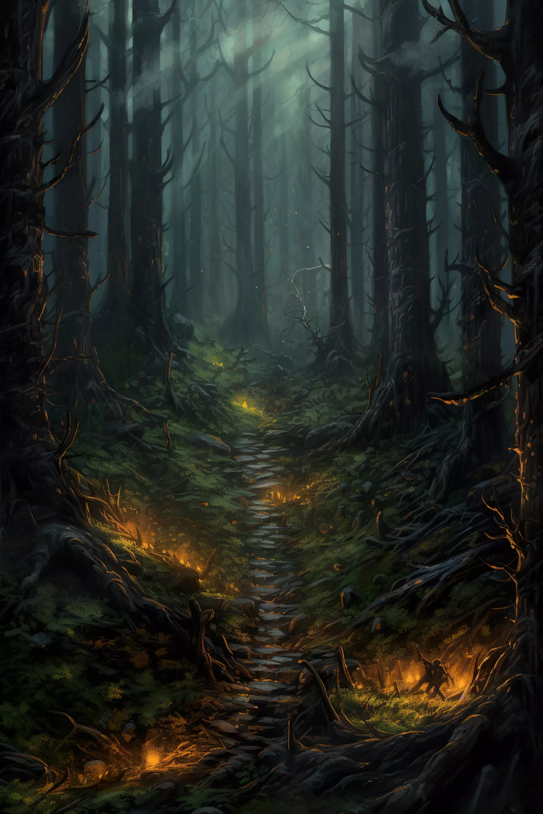 ¡Sí, mirad, han ido por ahí!No tardarían en darles caza, pero, oyeron un silbido que les heló la espalda. De donde provenía se abría un sendero que no habían advertido antes, y un gran brazo peludo les hizo una señal antes de desaparecer en la maleza. Beñat interpretó que era el mismísimo Basajaun, el Señor del Bosque, que les estaba ofreciendo una escapatoria. Los viejos dioses se estaban manifestando en su ayuda, ¿o era otra trampa? No se lo pensaron y se adentraron en el bosque, con la esperanza de llegar a Aralar y recuperar el Óbolo de Erio de las sorgiñas.