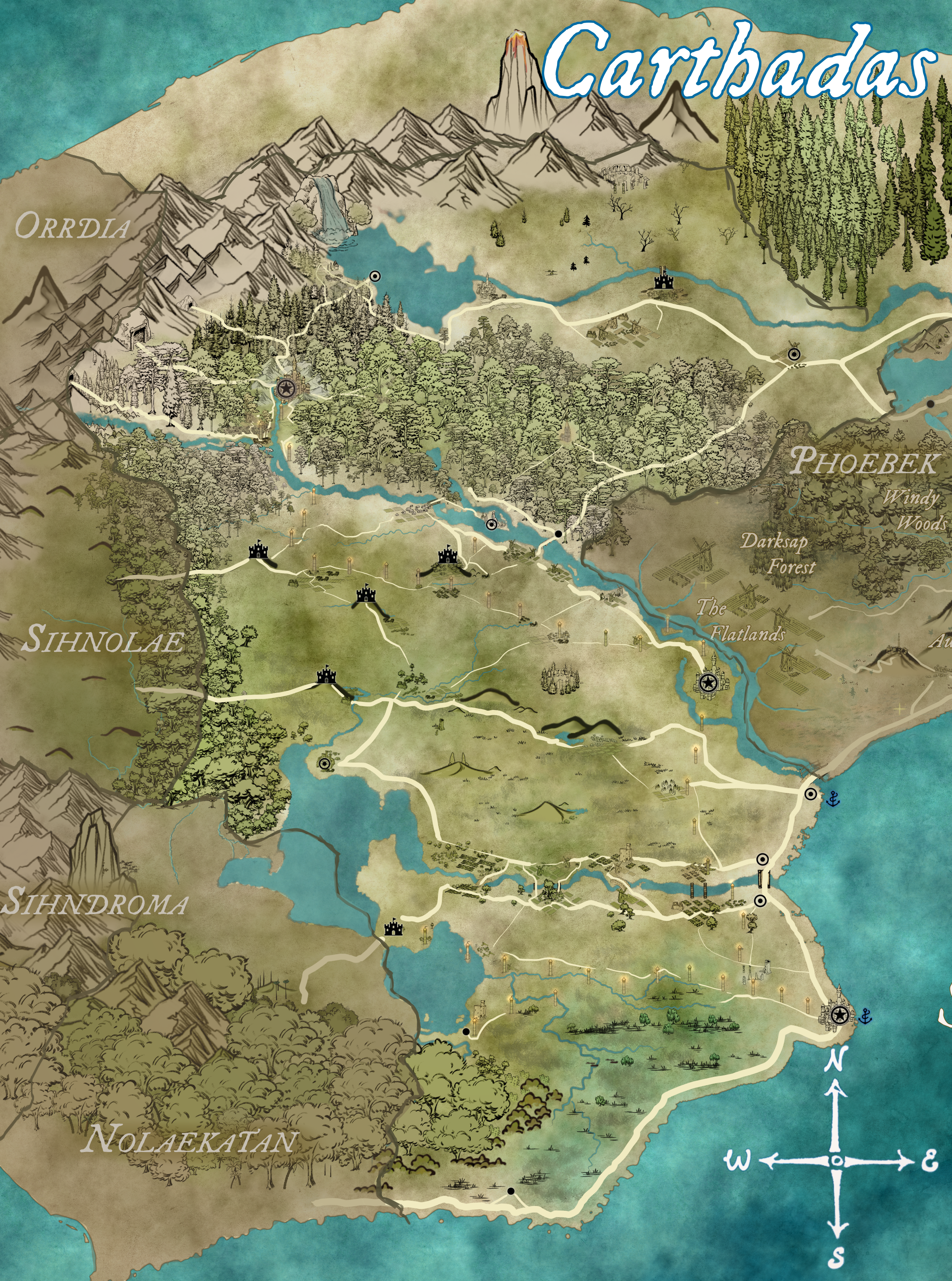 Carthadas is a political entity without political coherence. It contains separate territorial authorities - some consisting of no more than a castle and its surrounding land. The major lords are King Vadras (in the north), Queen Tainya (in the center), and Queen Karucia II (in the south), though the aristocracy under each of them have varying degrees of respect/fear/love for their liege lords and might be open to regime changes. Each of its rulers holds the title of Fürst (masc or neutral) or Fürstin (fem). They can also be referred to by a more generally recognized title - like “King” or “Queen”. People who address them with a hybrid of the local and general titles might refer to them as “Prince(ss) of the Land”, e.g., “Queen Taiyna of the Land”. Noble families of Carthadas are identifiable by the particles “von” or “van” before their surnames. Non-noble families will not have this particle as part of their names. Knights or lesser nobility may or may not have this particle. Political tensions between Carthadas and Sihnolae are high, due to the Empire’s recent conquest of Phoebek. Carthadas, surrounded by militaristic Sihnolae and its colonies, fears that the Imperial Army may march against them at any time. Because of this, the lords of Carthadas have begun conscription and stockpiling arms, armaments, and food. An upstart calling himself The Hand of Graveguard is causing trouble in the north of Carathas, waging war with help from monks of Alere. To this point, he has only claimed territory that none of the other rulers care about, on the borders of the Withered Expanse. His goals are unclear, but the future of Carthadas’ leaders may be uncertain….Culture