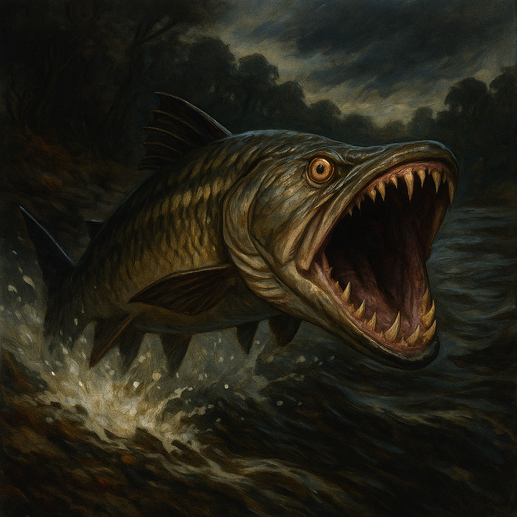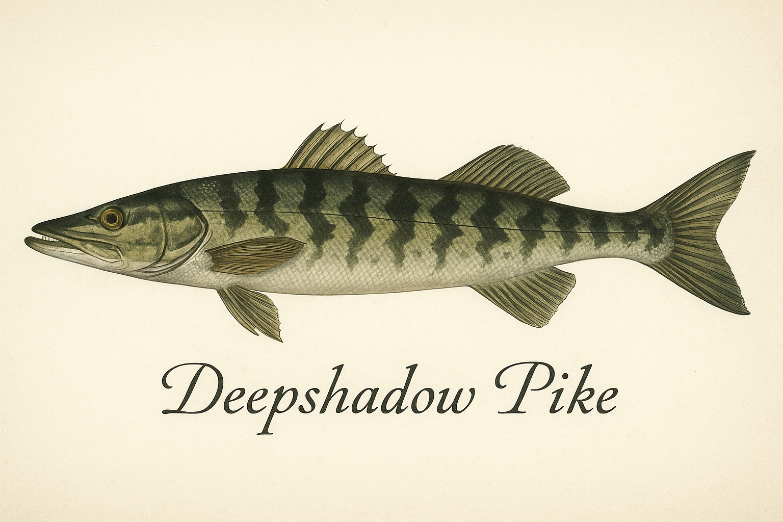 A long, torpedo-bodied predatory fish with jagged black striping over dark green scales found within the deep slow-moving channels of the River Chionthar in Faerŭn. Its gaping maw is lined with razor teeth. The Deepshadow Pike averages 5 feet (1.5 m) in length, but some up to 8 feet (2.4 m) have been found on rare occasion.