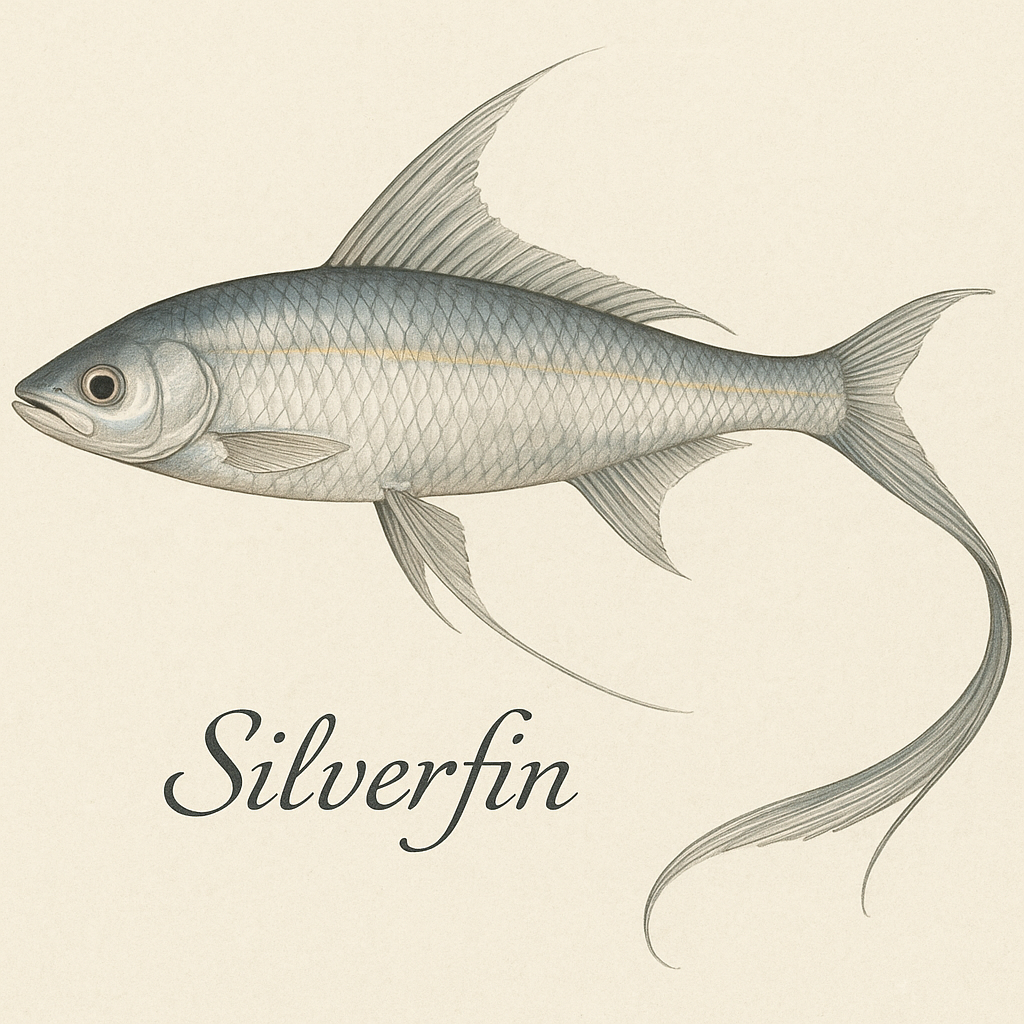 Appearance: A sleek, ribbon-bodied fish with shimmering silver scales that glint like sunlight on water. Its trailing dorsal fin gives it a graceful, ethereal quality.