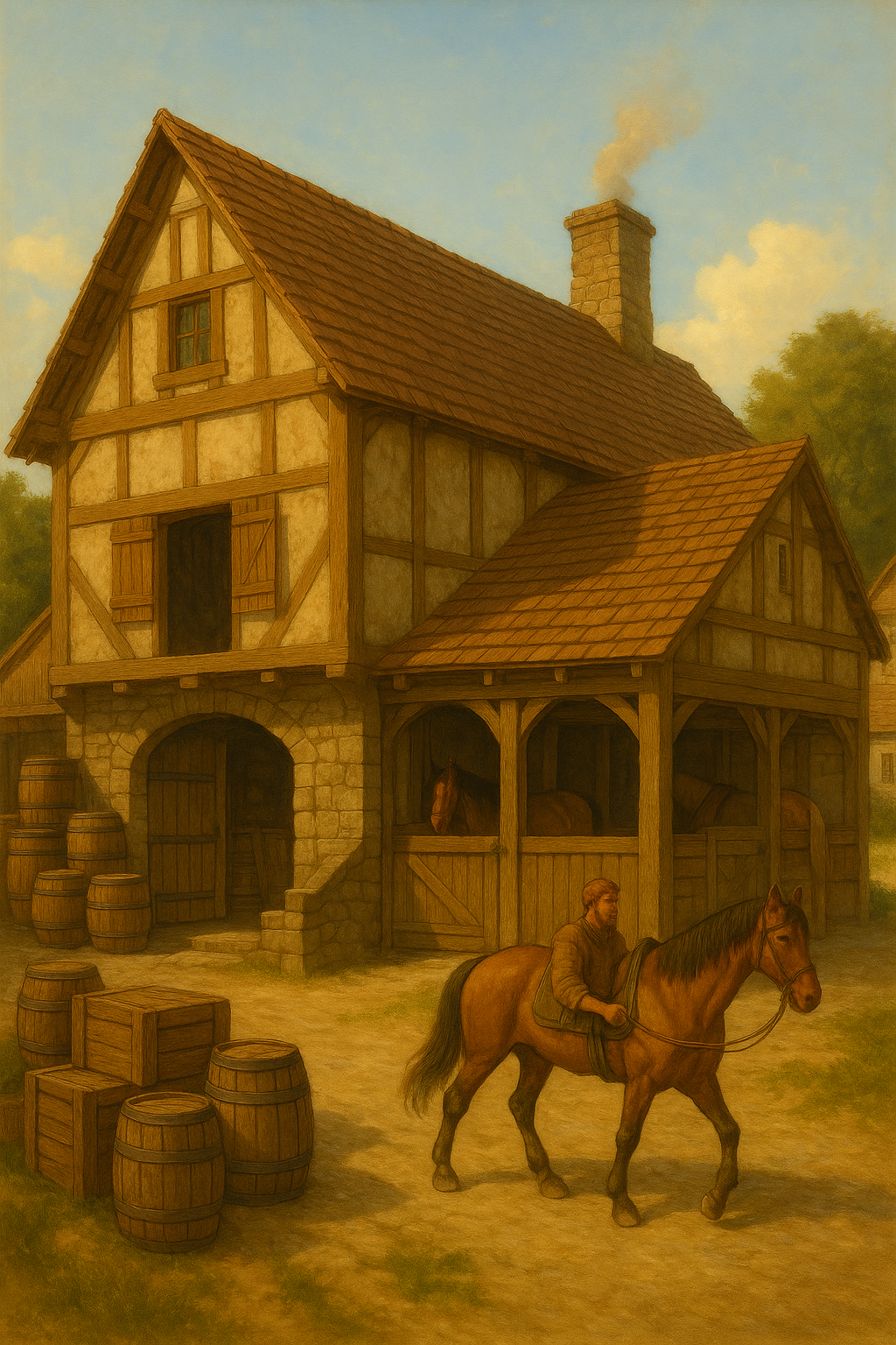 The building is constructed of stout timber and stone, its wide doors opening to reveal carefully organized bays for cargo and neatly swept stalls for horses. By day, it bustles with carters, stablehands, and merchants bringing wares to and fro. By night, it settles into quiet watchfulness, the scent of hay mingling with the creak of timbers.