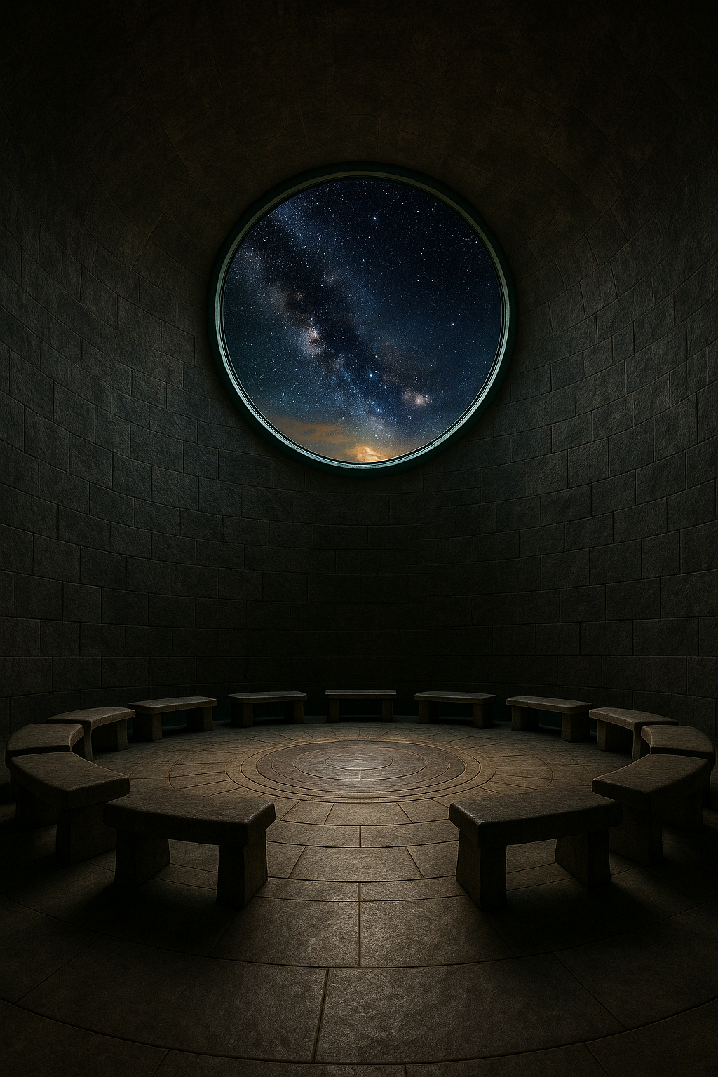 Circular, with one massive stained-glass oculus at the top that always shows the stars—even in daylight.