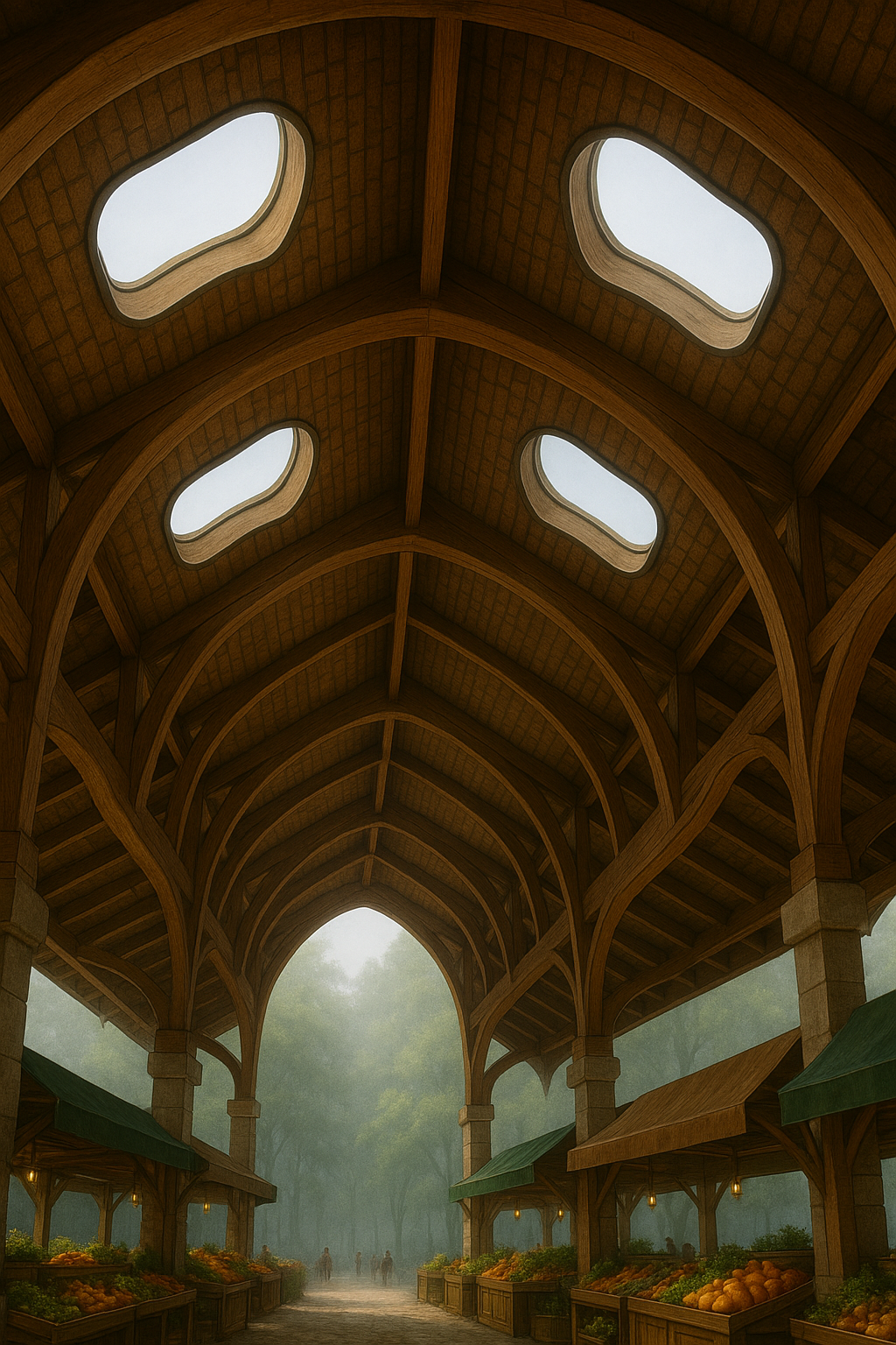 The Evenshade Market Pavilion is an elegant open-air structure standing like a crown at the edge of the village proper. Its graceful vaulting roof—made from reddish-brown brick and supported by intricately joined wooden arches—shelters the heart of Evenshade’s daily life. With no enclosing walls, the structure opens directly to the surrounding lands, letting fresh air and birdsong drift through the stalls.